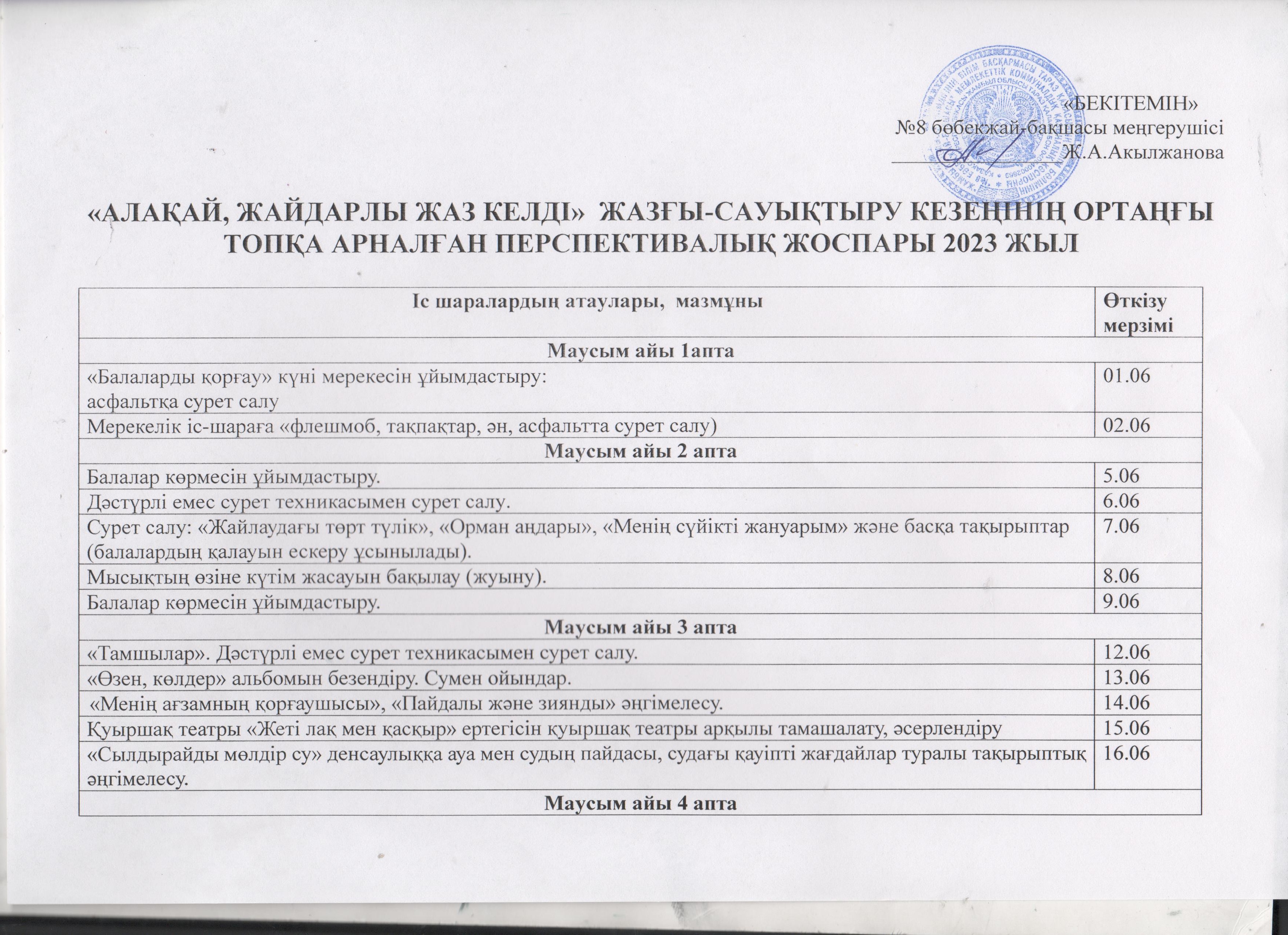 «АЛАҚАЙ, ЖАЙДАРЛЫ ЖАЗ КЕЛДІ» ЖАЗҒЫ-САУЫҚТЫРУ КЕЗЕҢІНІҢ ОРТАҢҒЫ ТОПҚА АРНАЛҒАН ПЕРСПЕКТИВАЛЫҚ ЖОСПАРЫ 2023 ЖЫЛ